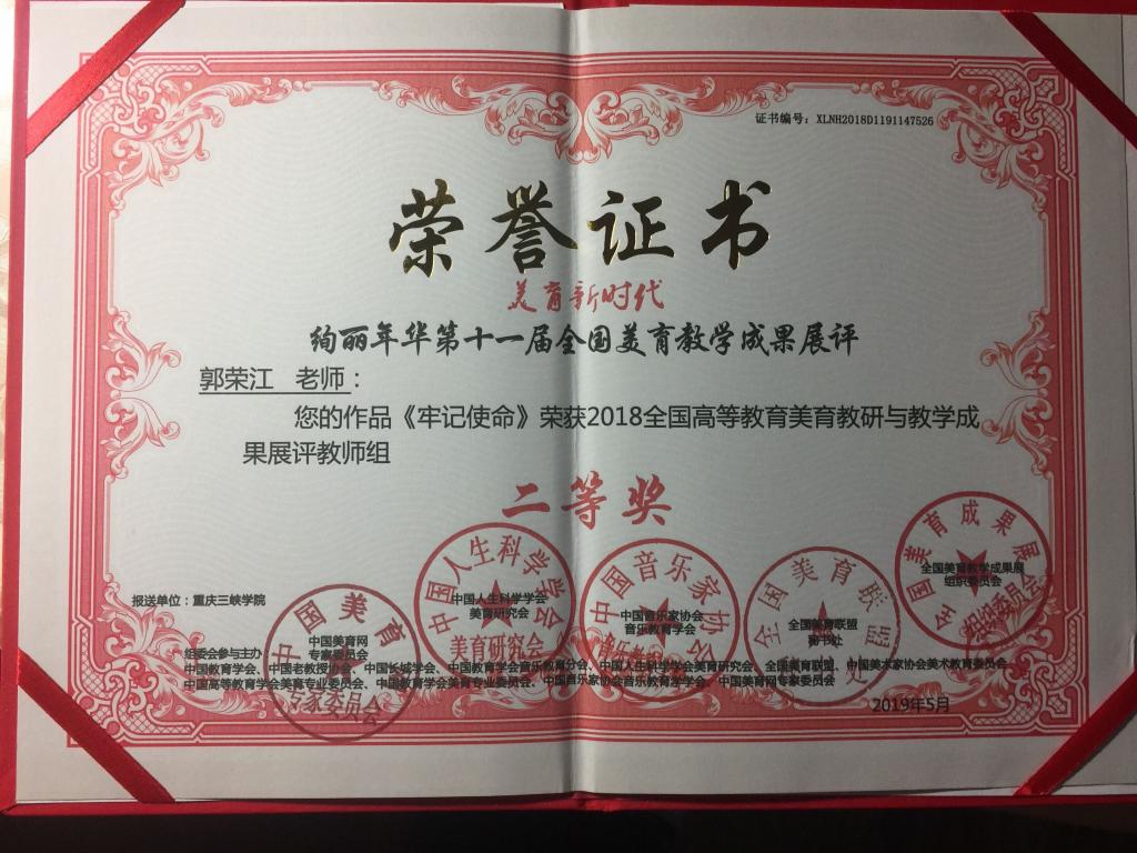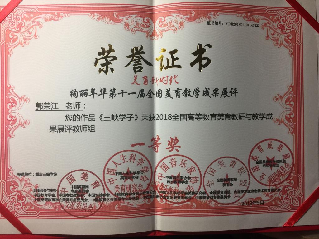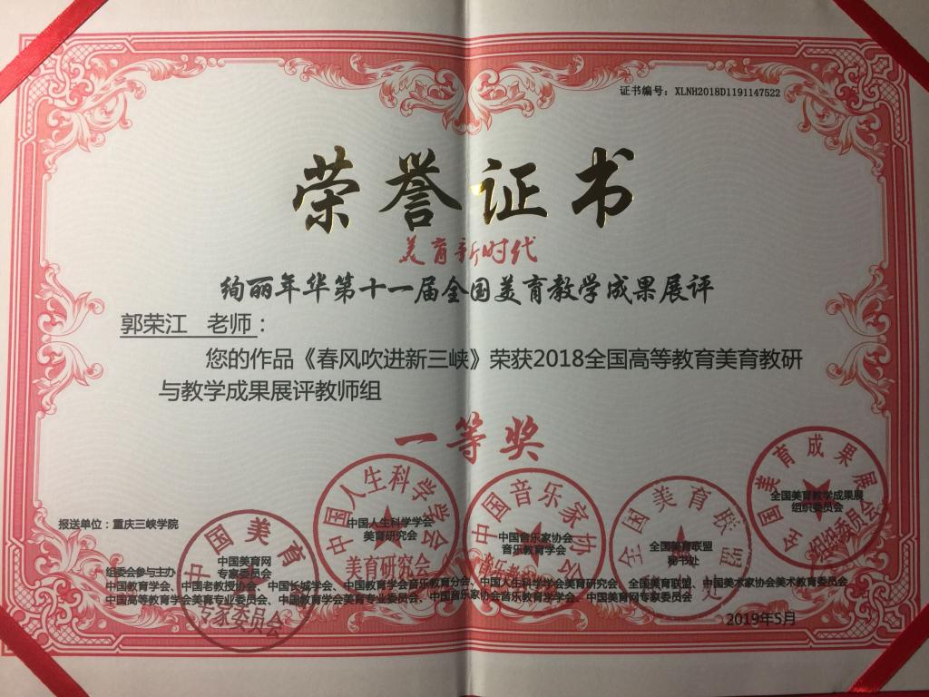 经“绚丽年华全国美育教学成果展组织委员会”评选后,公司教师郭荣江,其作品《三峡学子》和《春风吹进新三峡》均荣获2018全国高等教育美育教研与教学成果展评教师组一等奖,作品《牢记使命》荣获2018全国高等教育美育教研与教学成果展评教师组二等奖。