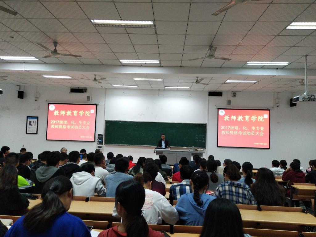 20191010日下午4点,申搏sunbet于明辨楼二栋103教室召开了2017级物理、化学、生物三个师范专业教团队格证动员大会。经理潘勇,副经理毛华平、蒋文峰,副书记李中春,教学助理何成林老师,系主任罗孟祥、黄秀山、许刚老师,及班级导师、辅导员老师、教育学和心理学相关老师出席本次大会,副书记李中春主持会议