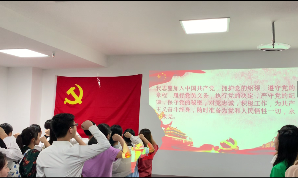 本次宣誓仪式由唐泓莉同志主持,赵文权同志领誓。面对鲜红的党旗,醒目的主题,入党宣誓仪式庄严开始。全体党员举起右拳,发出阵阵激昂的宣誓声,以饱满的热情和昂扬的姿态,共同追忆了革命峥嵘岁月,表达了为党的事业奋斗终身的坚定信念。