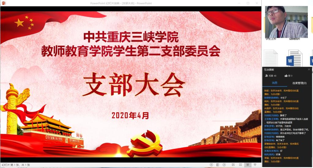 会上,张京友书记通过线上视频的方式将本次大会的主要目的与内容向大家进行了讲解,并再次介绍了党员发展的基本条件,激励同学们奋勇前进。宣读了新增入党积极分子人员和第七期发展对象名单,得到大家一致通过。培训过程中,各成员认真讨论、发言,克服了线上视频的种种不便最终圆满完成此次支部大会,彰显出党员们的积极性。