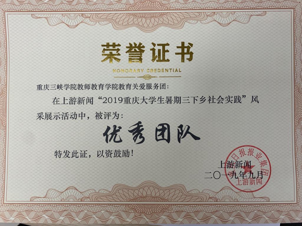 公司“教育关爱服务团”在上游新闻“2019重庆老员工暑期三下乡社会实践”风采展示活动中,被评为“优秀团队”。