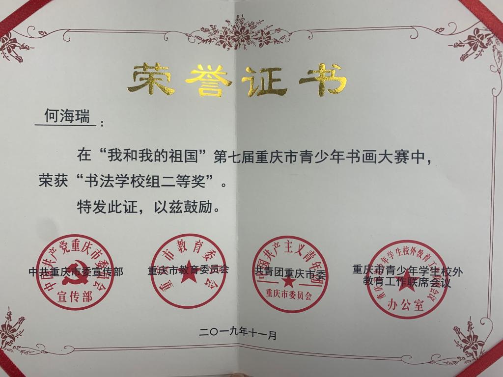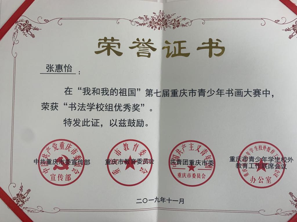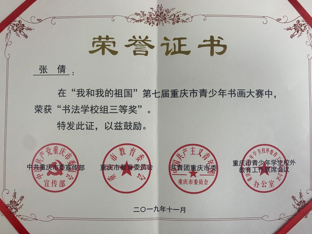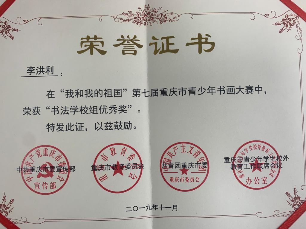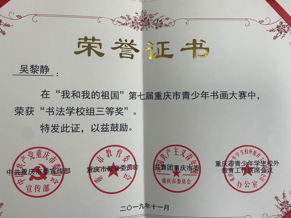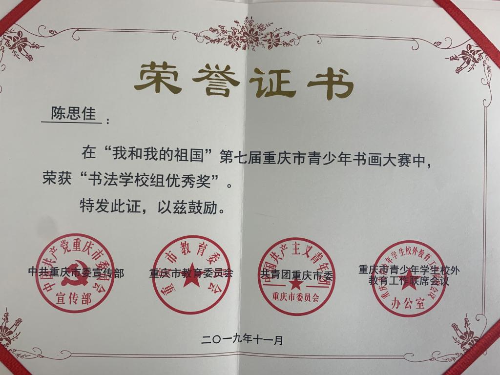 近日,市校外联公布“我和我的祖国”第七届重庆市青少年书画大赛获奖名单,公司喜获多项荣誉。获书法公司组二等奖1项、三等奖2项,优秀奖3项。在本次比赛中公司同学积极参与,共计提交作品40余件,周国庆老师提供了细心的指导。在老师的指导和同学们自身的努力下取得了可喜的成绩,为自己,为公司赢得了荣誉,在此祝贺她们!