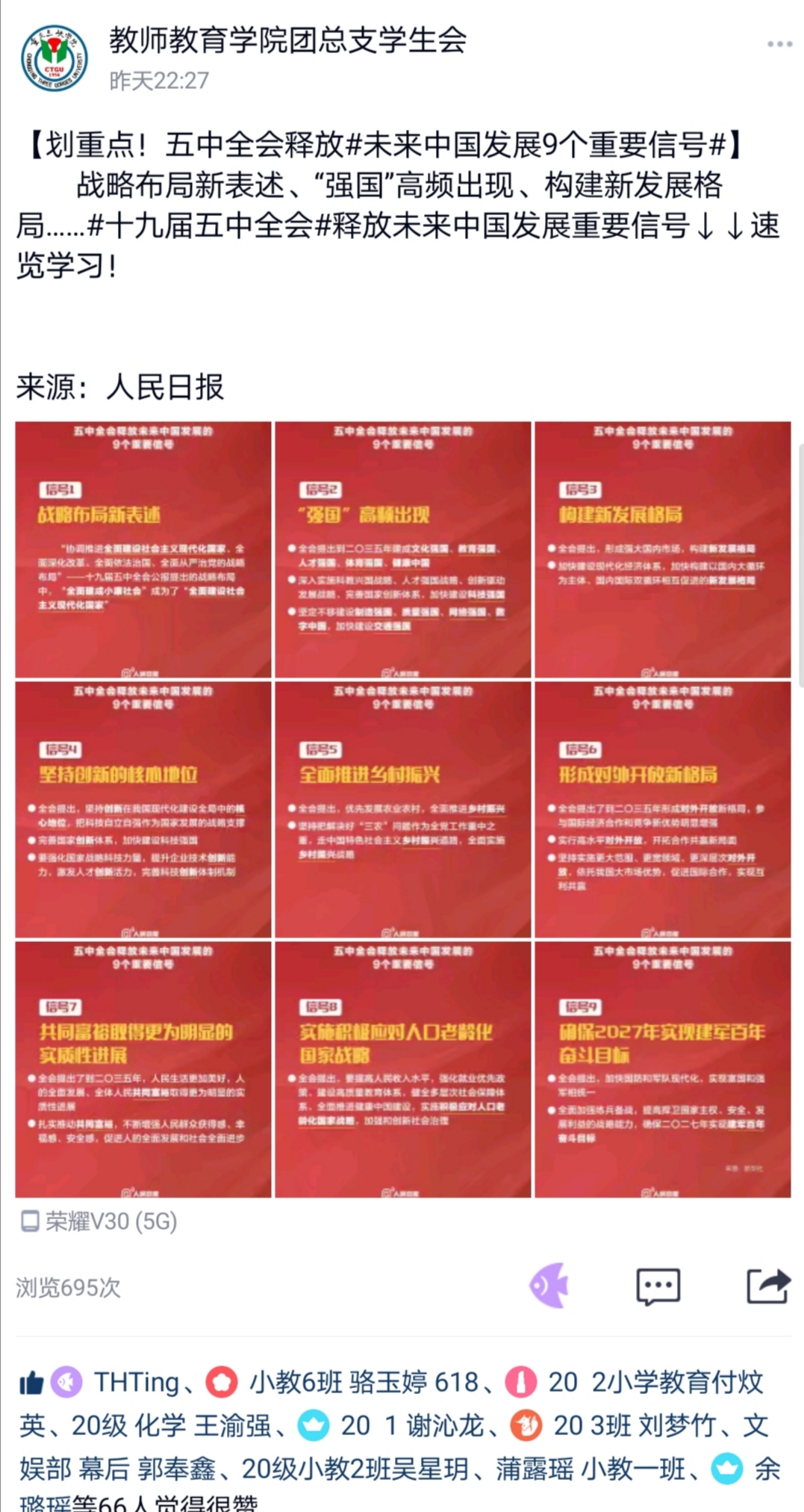 首先,院组织部组织各团支部开展了“深入贯彻学习党的十九届五中全会精神”主题团日活动。各团支部精心筹备,认真梳理学习全会精神的相关信息资料,各团支部通过朗诵、歌唱、情景剧等多种形式,让各青年团员从多角度学习并思考了党的十九届五中全会精神,使会议精神内化于心,外化于行。其次,利用院QQ公众号在QQ空间对党的十九届五中全会的相关精神进行报道,动员全院同学了解会议提到的坚定发展信心、明确发展目标、强化责任担当等多方面要义。