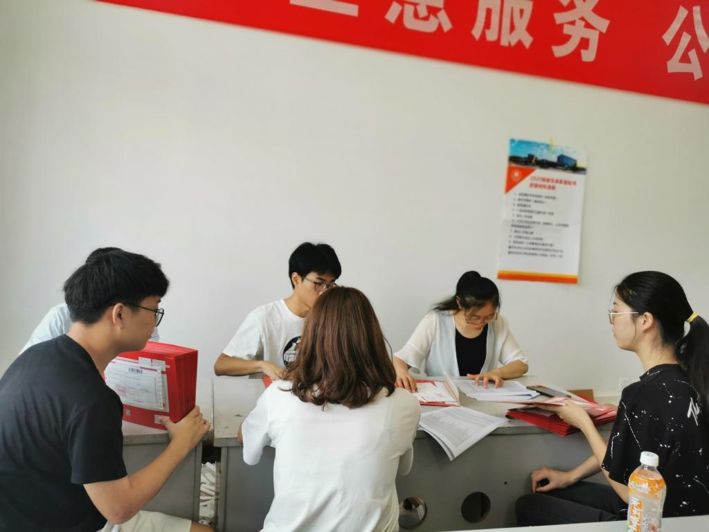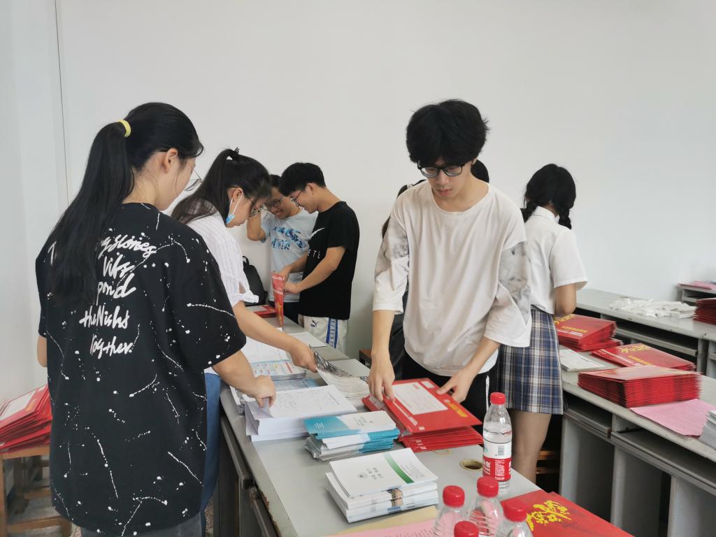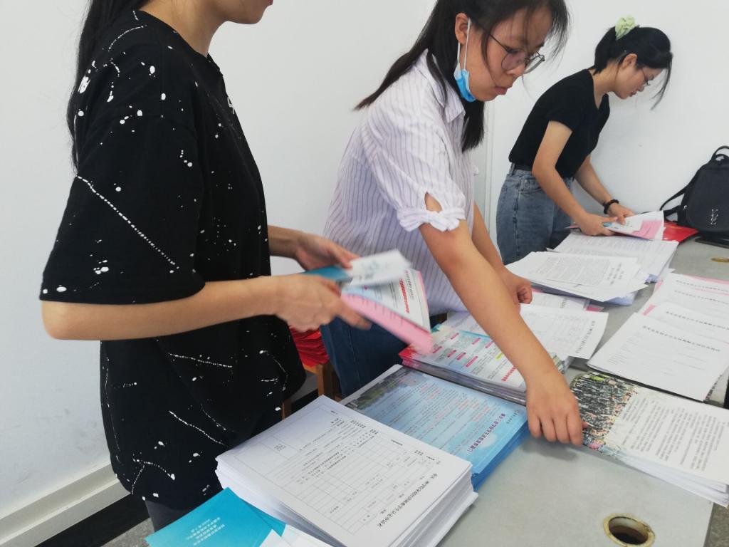 党员同志们一早便来到了志愿服务地点,领取相关材料清点份数并认真听取负责人强调注意事项。随后在冯梅老师的组织和带领下,同志们分为两个小组,分工合作,有序地展开录取通知书的装订行动,在此期间,大家相互交流沟通以保证活动的顺利完成。在装订结束之后,同志们又进行了一次检查核对,确保每份通知书都准确无误。