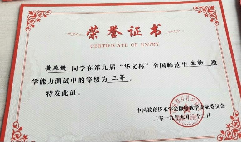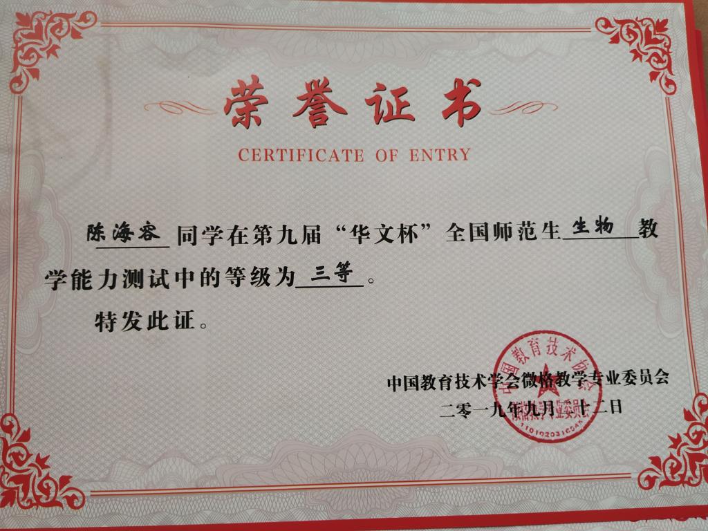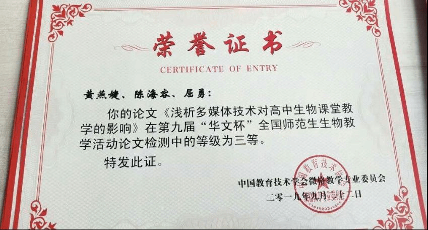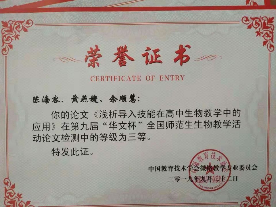 经过激烈角逐,由公司余顺慧教授、屈勇老师指导的黄燕婕、陈海荣同学在第九届“华文杯”全国师范生生物教学能力测试中均荣获三等奖;由黄燕婕、陈海荣、余顺慧编写的论文《浅析导入技能在高中生物教学中的应用》,陈海荣、黄燕婕、屈勇编写的论文《浅析多媒体技术在高中生物教学中的影响》在第九届“华文杯”全国师范生生物教学活动论文检测中均获三等奖。