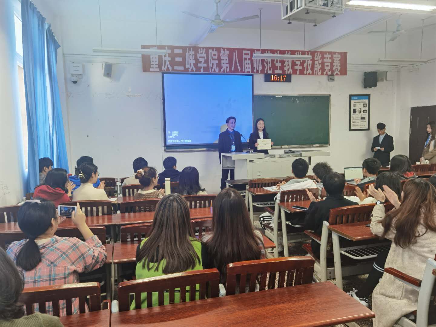 比赛分为多媒体课件制作、即兴演讲和现场授课三个环节。经过激烈角逐,公司小学教育专业陈婷婷获得文科组一等奖;生物科学(师范类)专业张真真获得理科组二等奖;物理学(师范类)专业向雨欣、化学(师范类)专业殷翠莲获得理科组三等奖。