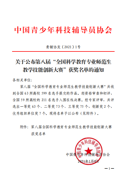 12月13日,由中国青少年科技辅导员协会主办、浙江师范大学和中国青少年科技辅导员协会、科学教师教育专业委员会共同承办的第八届全国科学教育专业师范生教学技能创新大赛决赛圆满结束。公司陈婷婷、张嘉欣同学获得一等奖,庞君毅同学获得三等奖,取得了优异成绩,彰显了公司学子的专业实力。