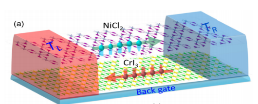 热自旋电子学(Spin Caloritronics)是近年来,自旋电子学领域兴起的热门研究方向,其核心是研究热流和自旋流之间的耦合关系,该领域研究成果有利于发展绿色信息和通讯技术,发展更节能的器件以及重新利用废热能提供理论基础;现阶段研究主要集中于观测和理解自旋赛贝克效应(即通过温差产生自旋电流)(Spin Seebeck effect)。在本工作中,作者考虑在二维范德瓦尔斯异质结中发现自旋赛贝克效应,构造了CrI3/NiCl2范德瓦尔斯异质结,发现电场可调控CrI3NiCl2间的磁耦合,当施加温度场时,自旋向上的电流在NiCl2层中流动,而自旋向下的电流在CrI3层中流动(如下图所示),即在器件中存在自旋赛贝克效应和热自旋过滤效应。