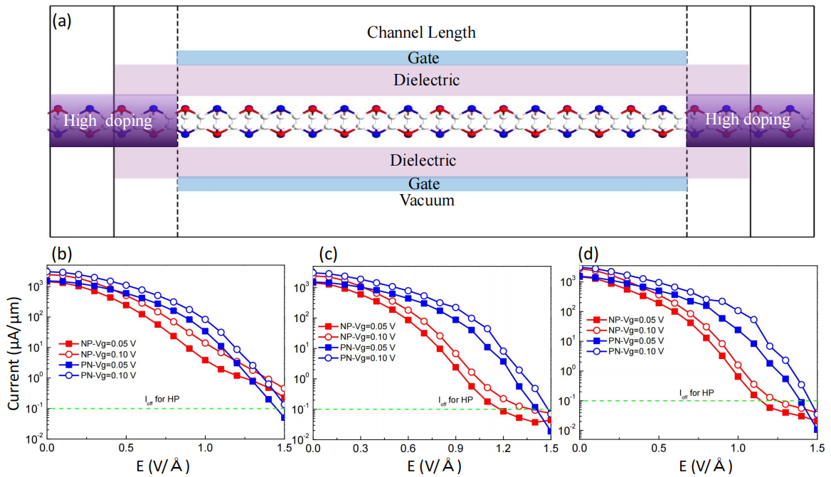 2. (a) 金属-半导体相变晶体管结构图。器件输运特征曲线:(b) 栅极长度3 nm, (c)栅极长度4 nm, (d) 栅极长度5 nm