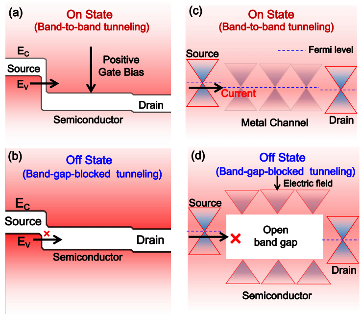 1. 隧道场效应晶体管原理,开态(a);关态(b)。金属-半导体相变晶体管原理,开态(c):沟道材料为金属;关态(d):沟道材料在外电场作用下变为半导体。